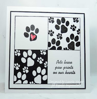 This card used the Quartet stamp, 8502-U, Pets Quartet. I stamped it using my stamp platform with Versafine ink and then heat embossed it using clear embossing powder. I colored the heart in the paw red and then stamped another paw print in the inside of the card. I did layer this with black cardstock and mounted in onto a 5 x 5 card base.