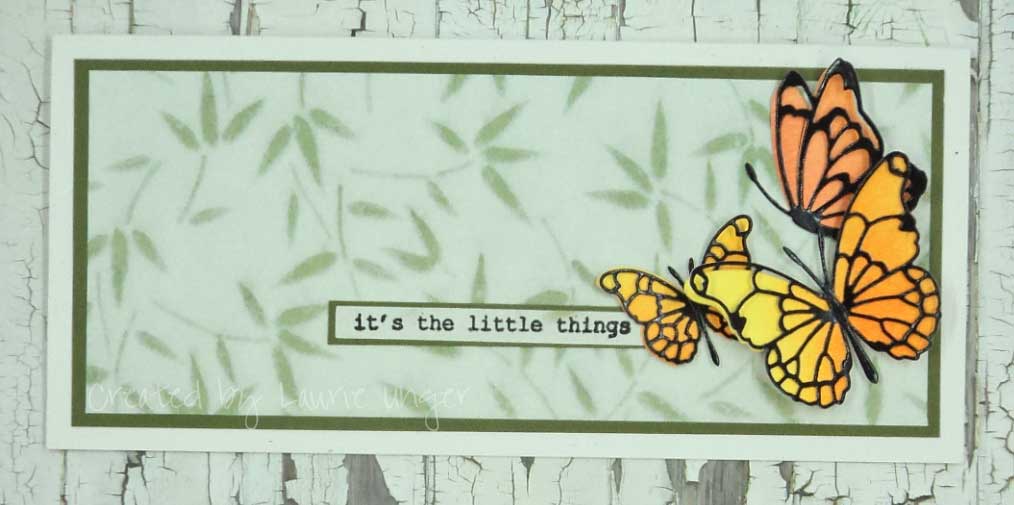 I used one of the butterflies from the quartet stamps to create this little square. Colored with copies and I added some dots around the perimeter to go with the designer paper.