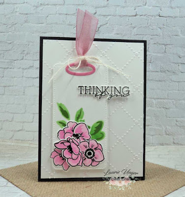 The flowers and sentiment are from The Stamp Market. I used a stencil to color the flowers, then cut them out using the coordinated dies. The leaves on the tag are stenciled directly on it, then I arranged the flowers over them. For the background, I used a dotted quilted stencil and some glossy stencil paste from Dreamweaver. The tag die is from Gummiapan, and the tag reinforcer and ribbon are colored with a Copic marker.